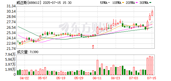 证券时报·数据宝统计显示,威迈斯今日收盘价为30.03元,上涨2.91%,日换手率为2.82%,成交额为2.14亿元,全天主力资金净流出3191.24万元,近5日该股累计上涨10.89%,近5日资金合计净流出4836.23万元。